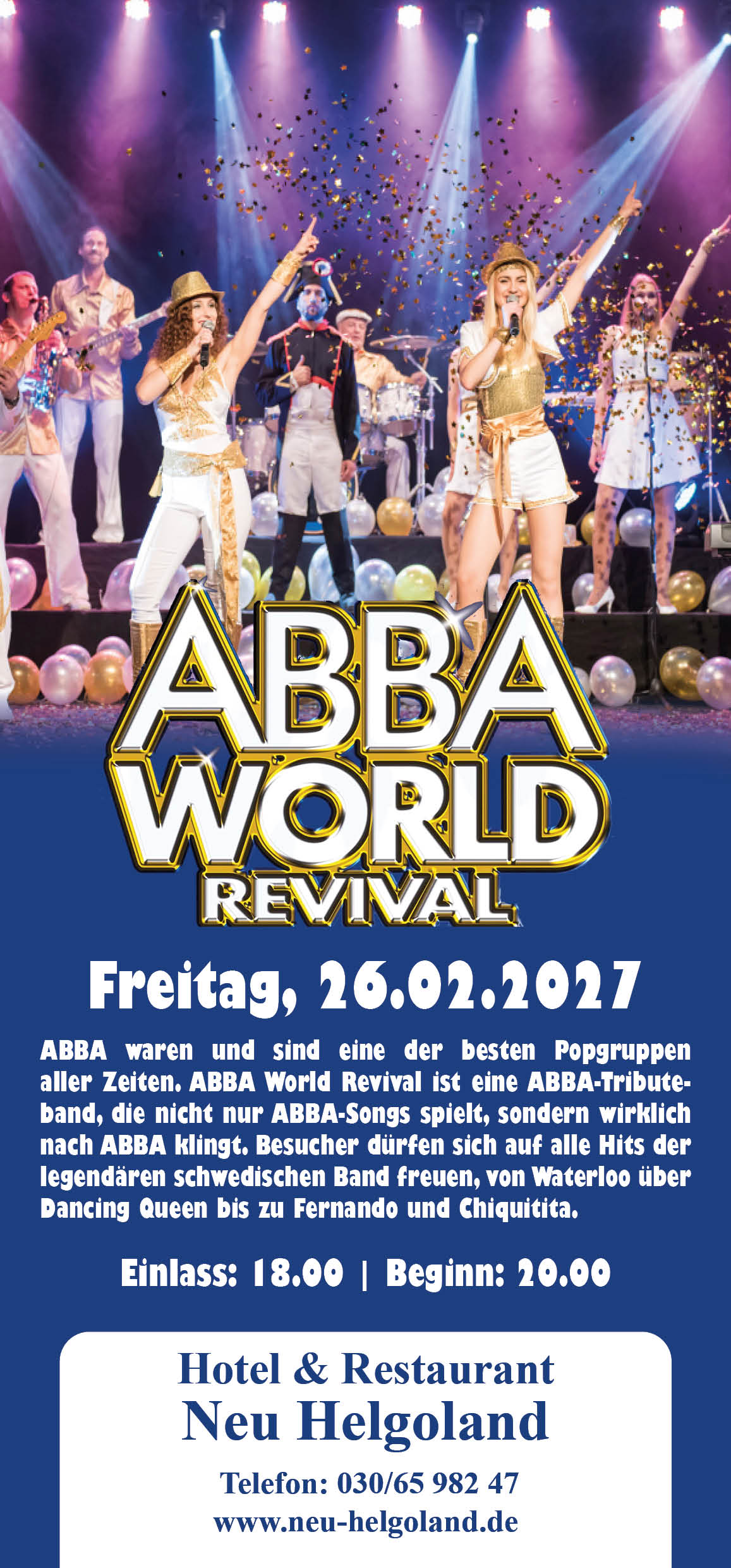 ABBA World Revival Datum Fr., 26.02.2027 Uhrzeit (Einlass: 18.00 Uhr) 20:00 Kartenverkauf Vorverkauf bei uns vor Ort, über EVENTIM oder allen Vorverkaufsstellen Künstler ABBA World Revival Webseite www.abbaworldrevival.com Tickets kaufen HINWEIS ZUR GASTRONOMIE Bitte beachten Sie, dass es bei unseren Abendveranstaltungen möglich ist, vor den Konzerten zwischen 18.00 und 20.00 Uhr am reservierten Tisch zu speisen.
